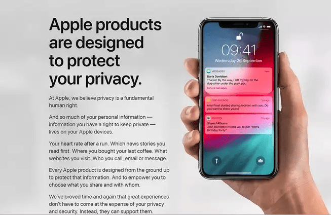 ومع أن شركة آبل تجمع هي كذلك المعلومات مثل موقع الهاتف لتفعيل ميزة "العثور على الـ iPhone" على سبيل المثال، والتطبيقات المثبتة -لاقتراح تطبيقات أخرى عليك- إلا أنها تبقى أكثر تحفظاً بشأن البيانات التي تجمعها. علاوة على ذلك، قامت شركة آبل أيضاً بتوفير المزيد من مزايا الأمان الرقمي في تطبيقاتها الخاصة، مثل ميزة "منع التعقب أثناء تصفح عدة مواقع" في تطبيق Safari، وتشفير كلا طرفي المراسلة في تطبيقها iMessage.
