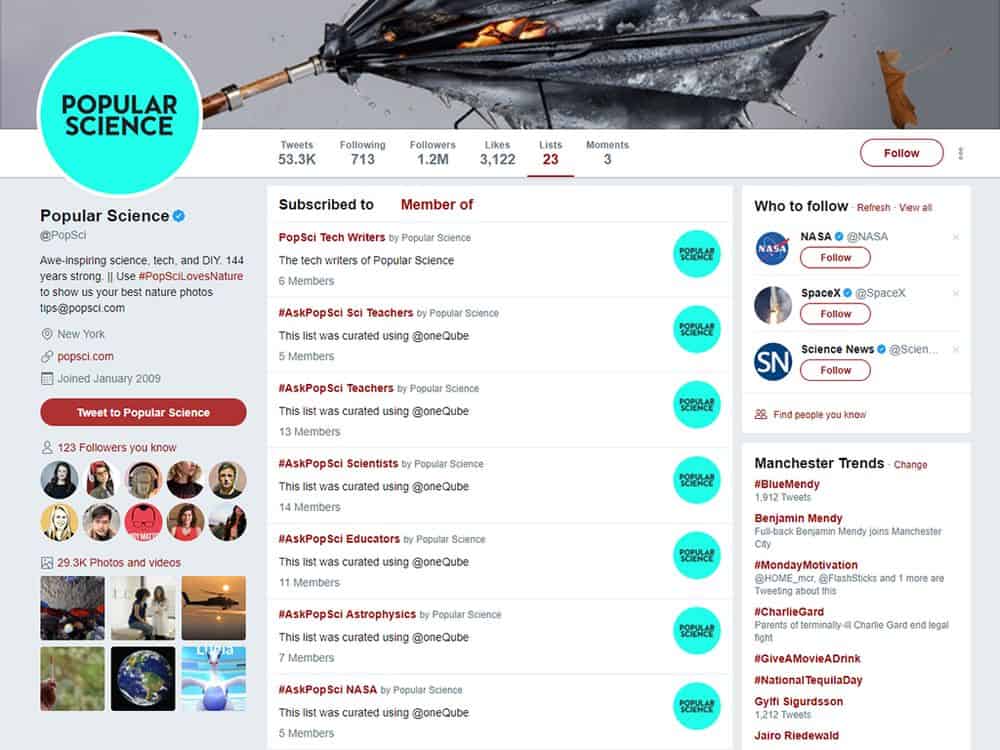 لإنشاء قائمة على تويتر، قم ببساطة بفتح صفحة حساب أحد الذين ترغب إضافتهم إلى القائمة، ومن ثم النقر على النقاط الثلاثة في الجهة اليمنى من الصفحة، وبعدها اختيار الإضافة أو الحذف من القوائم. ستنبثق نافذة تسمح لك بإضافة الحساب إلى قائمة موجودة من قبل أو جعله العنصر الأول في قائمة جديدة. أما على هاتفك، يمكنك العثور على خيار القوائم بفتح أحد الحسابات والنقر على النقاط الثلاثة (أندرويد) أو رمز المسنن (آي أو إس).