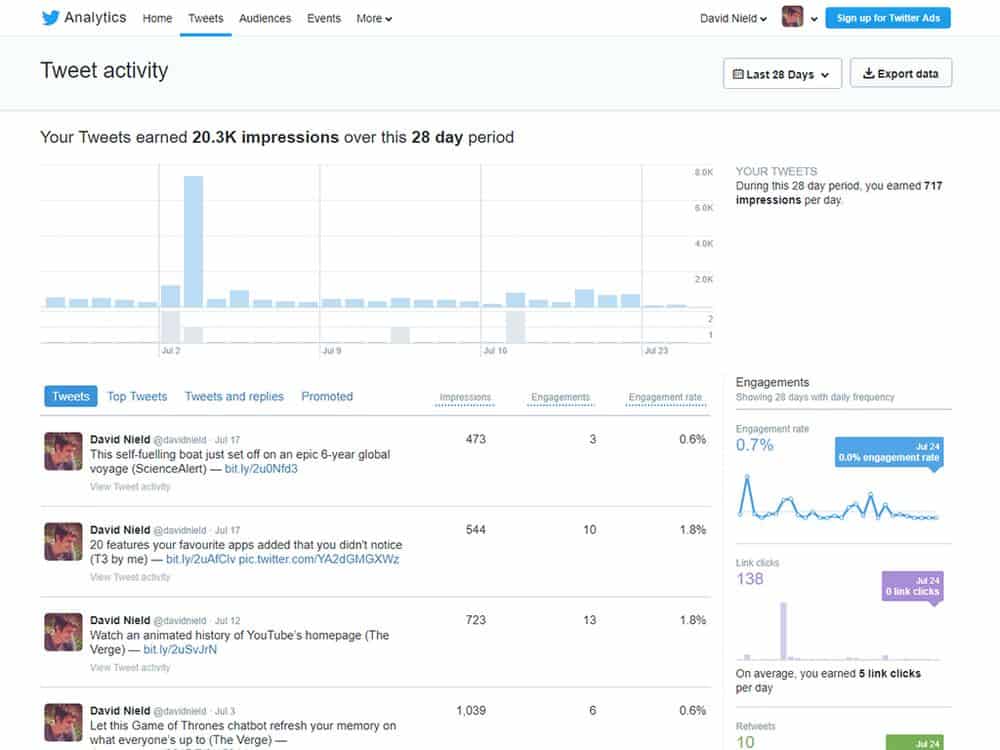 لديك تغريدة جديدة رائعة ستجعل تويتر يشتعل حماسة لها. ولكن كيف يمكنك أن تتأكد أنها تؤدي بأفضل شكل ممكن؟ لتحقيق هذا، يجب أن ترى نوع التحديثات التي تهم متتبعيك، وما يمكن أن يحدث أثراً كبيراً لدى جمهورك. ولهذا قام موقع تويتر بإحداث هذه الأداة التحليلية المجانية الخاصة به، وإتاحتها أمام جميع المستخدمين. يمكنك بعد الوصول إلى الصفحة التحليلية أن ترى مقدار تغريداتك، وكم تكتسب هذه التغريدات من الانتشار مع الزمن، وعدد المتتبعين الجدد وزيارات صفحتك الخاصة، وغير ذلك. إذا أردت دفع مبلغ من المال للترويج لبضع المنشورات على الشبكة، يمكنك أن تفعل هذا من الصفحة التحليلية أيضاً.