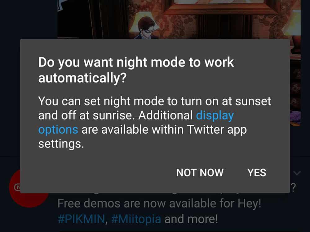 للوصول إلى خيار الوضع الليلي، يجب أن تذهب إلى قائمة التطبيق، وفتح الإعدادات والخصوصية، ومن ثم النقر على أسلوب العرض والصوت. إذا كنت تستخدم هاتفاً بنظام أندرويد، يقدم لك تويتر خياراً إضافياً: انقر على بند الوضع الليلي في القائمة، ويمكنك أن تجعل منظر الواجهة يتغير آلياً إلى الألوان الداكنة اعتماداً على توقيت الشروق والغروب في منطقتك.