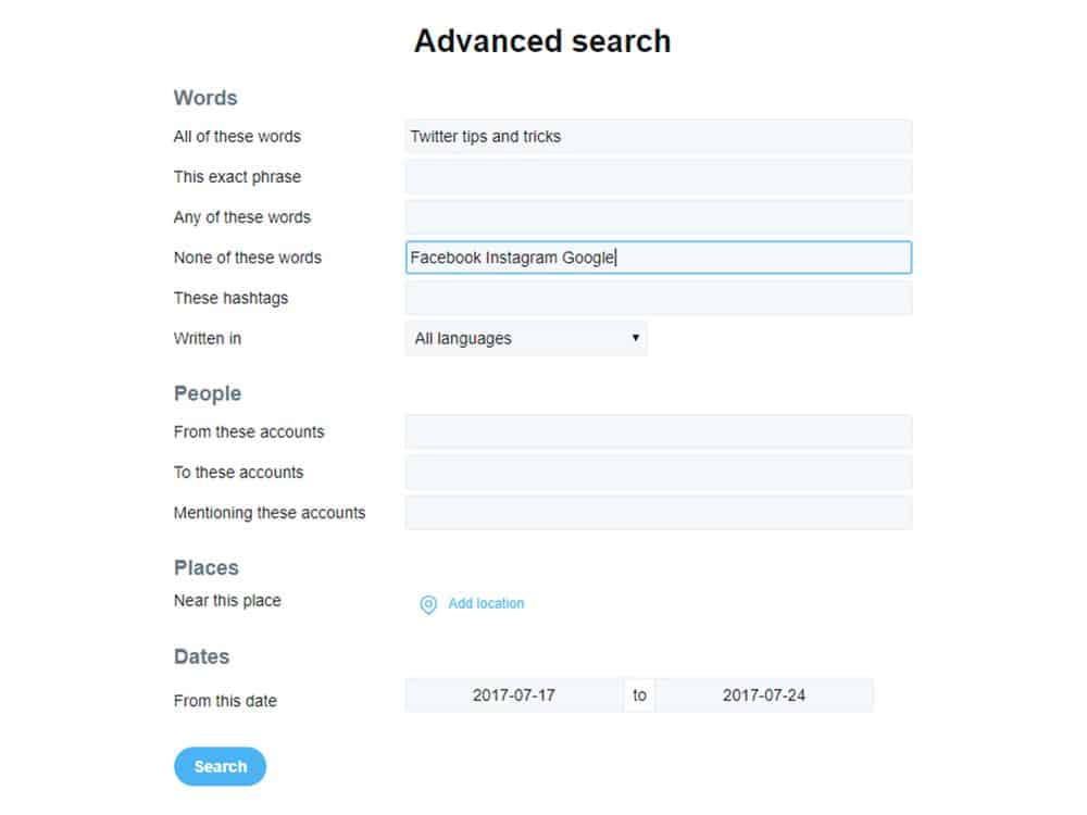 إضافة إلى إمكانية استخدام كلمات مفتاحية معينة واستبعاد كلمات أخرى، يمكنك البحث عن التغريدات بناء على الحساب الذي كتبها، أو الموضع الجغرافي، أو التاريخ، أو اللغة، وغير ذلك. ويمكنك بهذه الإمكانات المتقدمة أن تتحول فورياً إلى صياد ذي قدرات خارقة على تويتر.