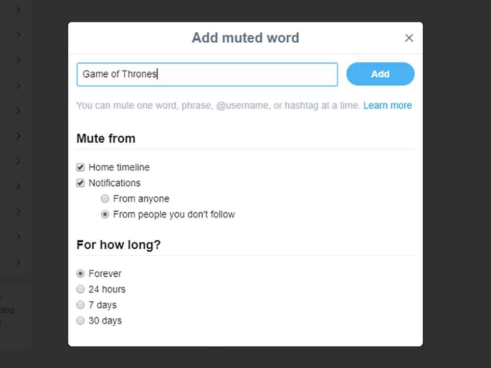 هل سئمت من سماع أخبار قصة جديدة أشعلت موقع تويتر حماسة؟ هل تحاول تجنب معرفة الأحداث المقبلة لمسلسلك التلفزيوني المفضل؟ حان الوقت لكتم كلمات معينة إذاً. وهي ميزة تمنع التغريدات التي تحتوي على جمل معينة من الظهور على قائمة الأخبار الأساسية لديك أو ضمن إشعاراتك. غير أنها ستظهر ضمن عمليات البحث.