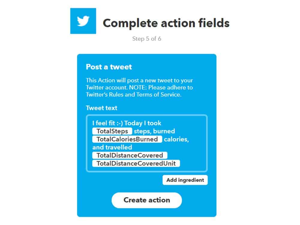 الخطوة الأولى هي تسجيل حساب مجاني على الموقع iffttt.com وتصل التطبيقات التي ترغب باستخدامها. وما أن تفعل ذلك، يمكنك أن تبدأ ببناء برامج صغيرة، تسمى بالتطبيقات المصغرة (بريمجات). وهي سهلة لدرجة أنه يمكن حتى للمبتدئين أن يقوموا بهذه العملية، كما أن IFTTT يقوم بإرشادك خلال العملية بأكملها. في هذا الوضع، ستحتاج إلى تطبيق مصغر يستجيب لمنبه، مثل إشارة تنبيه من جهاز تتبع اللياقة البدنية تقول أنك حققت هدفك، مع إجراء موافق، وهو في هذه الحالة تغريدة.
