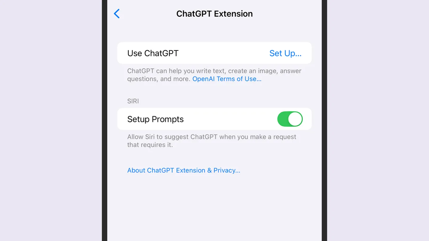 أخيراً، يمكنك إعداد تشات جي بي تي في تطبيق سيري (Siri) من خلال الانتقال إلى الإعدادات والنقر على آبل إنتيليجنس وسيري (Apple Intelligence & Siri) ثم على تشات جي بي تي (ChatGPT)، ما سيمكّنك من منح سيري إمكانية الوصول إلى تشات جي بي تي للحصول على إجابات أطول أو أعقد. يمكنك أيضاً ربط حسابك في تشات جي بي تي مع سيري ولكنك لست مضطراً لذلك، وإذا كان لديك حساب تشات جي بي تي بلس (ChatGPT Plus)، فستتمكن بربطه مع سيري من "استخدام إمكانات تشات جي بي تي المتقدمة أكثر" وفقاً لآبل.