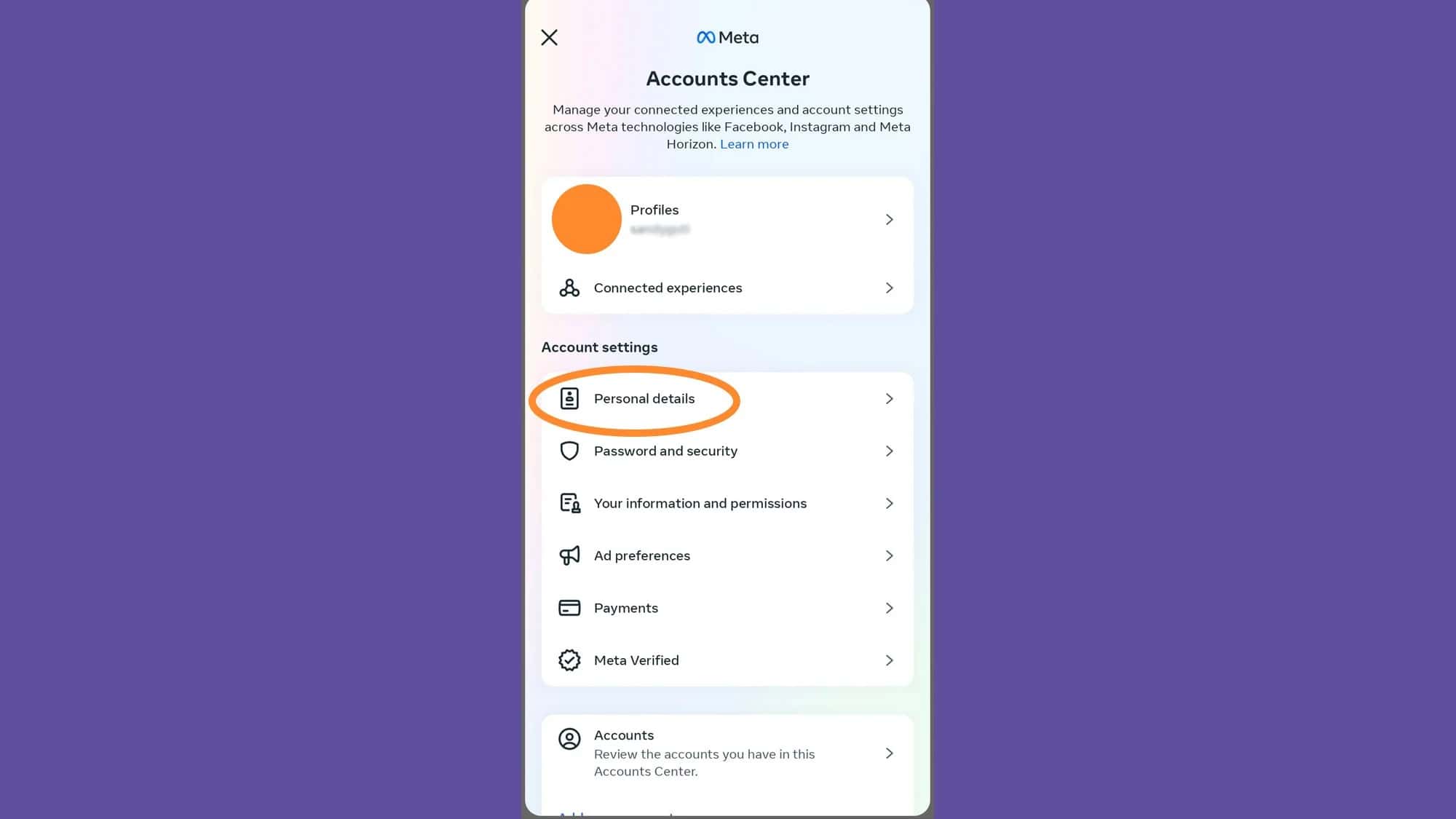 2. ابحث عن مربع مركز حسابات ميتا، ثم انقر على رؤية المزيد في مركز الحسابات (See more in Accounts Center).