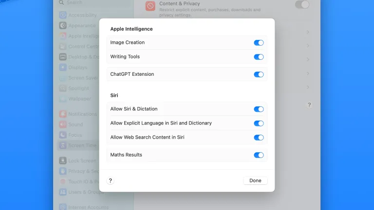 لسبب ما، يمكنك إلغاء تفعيل أدوات الكتابة وإنشاء الصور من خلال شاشة وقت الشاشة (Screen Time). افتح الإعدادات أو إعدادات النظام وانقر على وقت الشاشة (Screen Time) ثم على المحتوى والخصوصية (Content & Privacy)، واحرص على تفعيل مفتاح تبديل المحتوى والخصوصية (Content & Privacy) لتحصل على خيار تحت عنوان آبل إنتيليجنس وسيري (Apple Intelligence & Siri) حيث يمكنك إلغاء تفعيل أدوات الكتابة (Writing Tools) وإنشاء الصور (Image Creation).