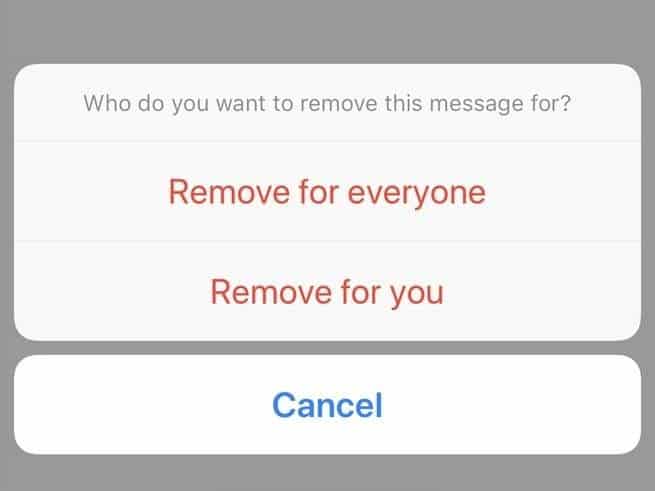 ويعدّ تطبيق Facebook Messenger أحد هذه التطبيقات التي تقدم هذه الميزة الفريدة حالياً، سواء على نظام الأندرويد أو الآيفون، كل ماعليك فعله لحذف الرسالة هو الضغط بإستمرارٍ عليها لتظهر قائمة منسدلة ثم تختار منها "حذف من الجميع". يجب ملاحظة أن الوقت المتاح لحذف الرسالة من الجميع بعد إرسالها هو 10 دقائق فقط، بعدها لن تتمكن من حذف الرسالة.