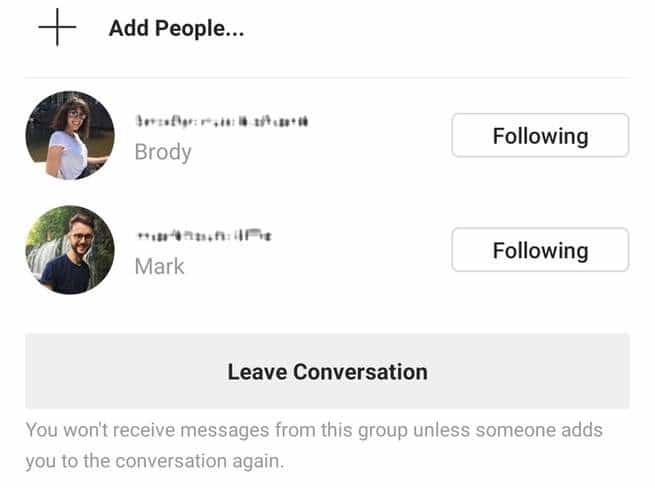 ستعثر على زر "مغادرة المجموعة" بسهولة نوعاً ما في أغلب تطبيقات الدردشة التي تستخدمها. يمكنك في تطبيق "إنستاغرام"- مثلاً- الضغط على الشريط العلوي ضمن الدردشة الجماعية فتظهر لك قائمةٌ أعضاء المجموعة، ثم تضغط على "مغادرة المجموعة" إن لم تعد تهمك وتزعجك للخروج منها ببساطة.