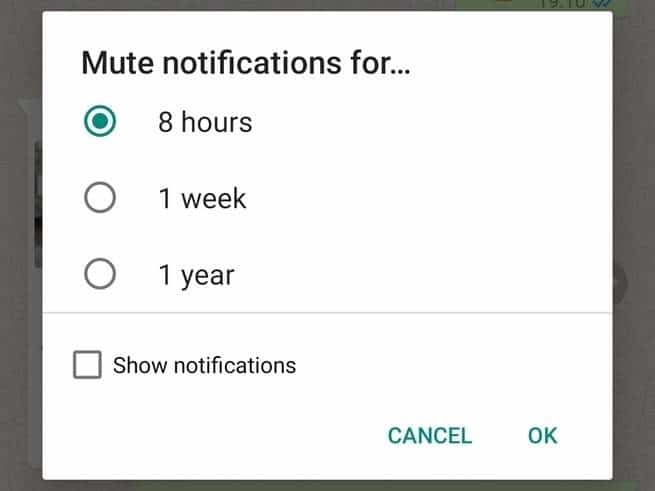 تتيح لك معظم تطبيقات المراسلة خياراتٍ تكتم الإشعارات لزمنٍ محدد. فمثلاً، في تطبيق "واتساب" على الأندرويد: قم بالنقر فوق زر القائمة (شكله ثلاث نقاط أعلى التطبيق في الزاوية اليمنى)، ثم اختر كتم الإشعارات واضبط المدة الزمنية المرغوبة ببساطة.
