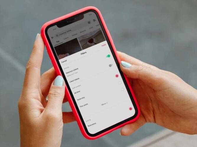 أولاً، انقر فوق أيقونة البحث (العدسة المكبرة) في الزاوية العليا اليمنى من واجهة التطبيق. ثم اكتب كلمات البحث الرئيسية ذات الصلة بمقطع الفيديو واضغط على بحث. بعد ذلك، اضغط على أيقونة المرشح (خطان بهما دوائر) على يمين شريط البحث، وقم بتشغيل مفتاح «مقاطع الفيديو المُشاهدة» (Watched videos) في أعلى اليمين، واضغط على «تطبيق» (Apply). سيؤدي هذا إلى تغيير نتائج بحثك بحيث تبرز مقاطع الفيديو التي شاهدتها خلال الأيام السبعة الماضية فقط.