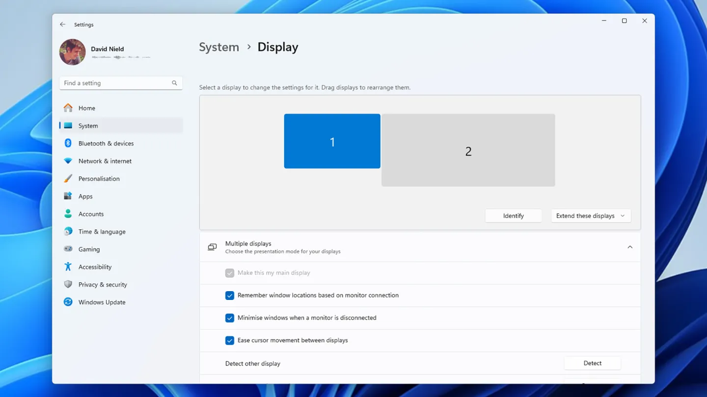 في نظام ويندوز، افتح الإعدادات (Settings) ثم توجه إلى النظام (System) > العرض (Display) لتهيئة إعدادات شاشات متعددة. من خلال القائمة المنسدلة على اليمين، يمكنك أن تجعل نظام التشغيل يظهر نفسه على شاشتين (Extend these displays)، أو أن تجعله يظهر على شاشة خارجية فقط (Show only on 2). سترى أيضاً خيارات دقة العرض.