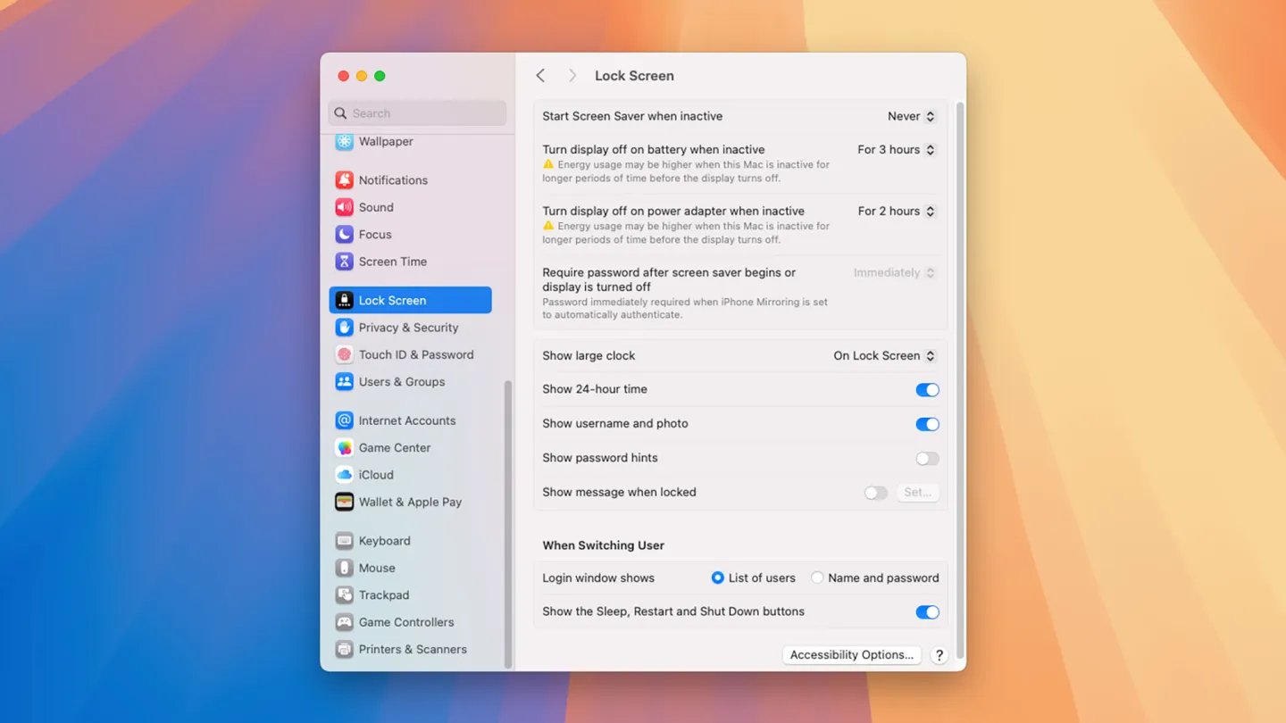 افتح علامة تبويب قفل الشاشة (Lock Screen) في إعدادات النظام، لتتمكن من التحكم في المدة التي ينتظرها نظام ماك أو إس قبل إيقاف تشغيل الشاشة بسبب عدم تفاعلك مع الجهاز على الإطلاق، إذا كنت تستخدم كمبيوترك المحمول على أنه كمبيوتر مكتبي، فقد ترغب في تمديد هذه المدة الزمنية. ومع ذلك، لا يوجد إعداد لإبقاء جهاز ماك بوك قيد التشغيل عند إغلاق الغطاء، كما هي الحال مع نظام التشغيل ويندوز: فما دام أن هناك شاشة خارجية ومحول طاقة متصلين، يجب ألا ينتقل جهاز ماك بوك الخاص بك إلى وضع السكون عند إغلاق الغطاء.
