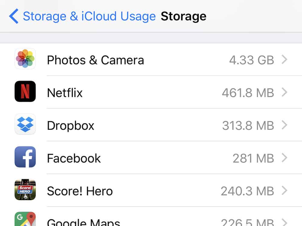 بعد الصور والفيديو، من المرجح أن تأتي التطبيقات والألعاب في المرتبة الثانية من ناحية مساحة التخزين المستخدمة. ولتجنب نفاد مساحة التخزين، يجب أن تقوم، وبشكل منتظم، بإزالة التطبيقات التي لا تستخدمها. تذكر أنه يمكنك أن تنصب هذه التطبيقات مرة أخرى لاحقاً بدون أن تدفع مرة ثانية، حيث تحتفظ شركتا آبل وجوجل بسجل للتطبيقات التي دفعت ثمنها.