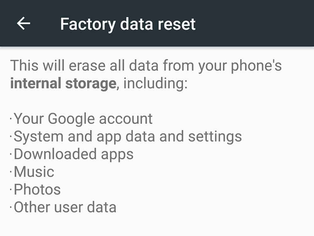 إعادة الضبط في أندرويد: يقوم أندرويد بتحذيرك حول الملفات والتطبيقات التي سيتم حذفها أثناء إعادة الضبط.