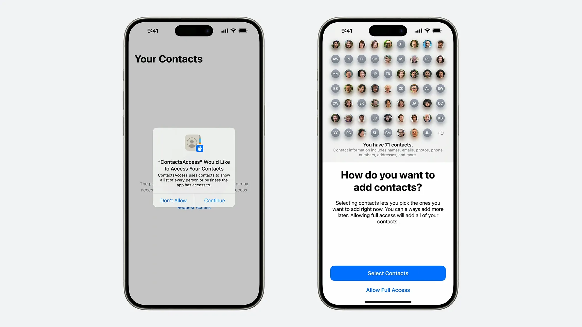 الخياران في مربع الحوار هذا هما "عدم السماح" (Don’t Allow)، الذي يمنع التطبيق من الوصول إلى جهات الاتصال، و"متابعة" (Continue)، الذي يُبرز نهج آبل الجديد في منح الأذونات إذا اتبعته. يمكنك بعد ذلك إما النقر على "تحديد جهات الاتصال" (Select Contacts) لاختيار مجموعة محددة من الأشخاص يستطيع التطبيق الاطلاع على تفاصيلهم، وإما اختيار "الوصول الكامل" (Full Access) لمنح التطبيق إمكانية الوصول الكامل.