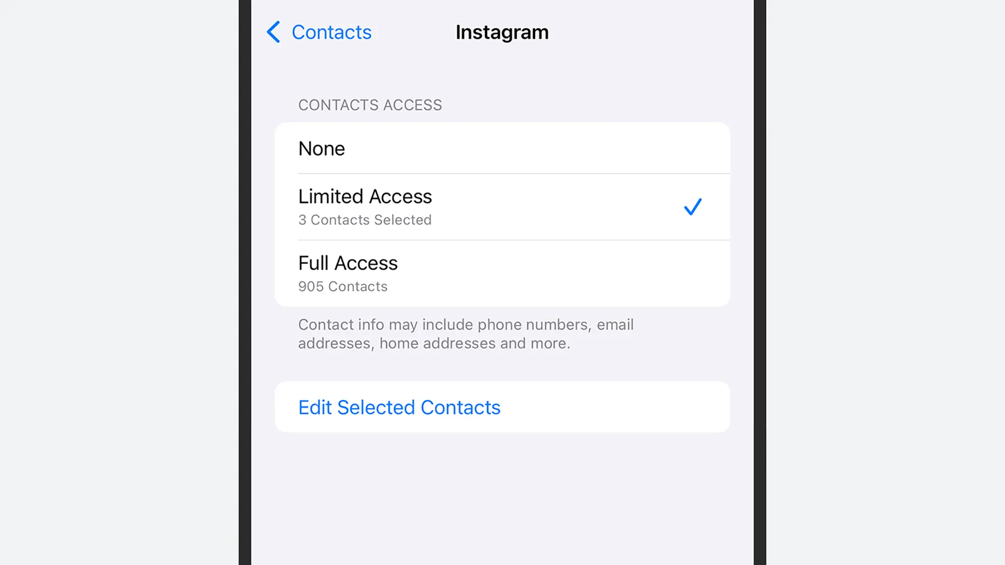 تقول شركة آبل إن هذا "يمنح المستخدمين القدرة على التحكم"، وإنه لا يمنعهم من الاتصال بأشخاص معينين من خلال تطبيق ما، لكنه يجنّبهم مشاركة المعلومات جميعها مع هذا التطبيق. ننصحك بمنح إمكانية الوصول الكاملة إلى جهات الاتصال فقط للتطبيقات التي تعرف أنها أهل للثقة، ولتلك التي تعرف أنها تحتاج إلى إمكانية الوصول الكامل هذه.
