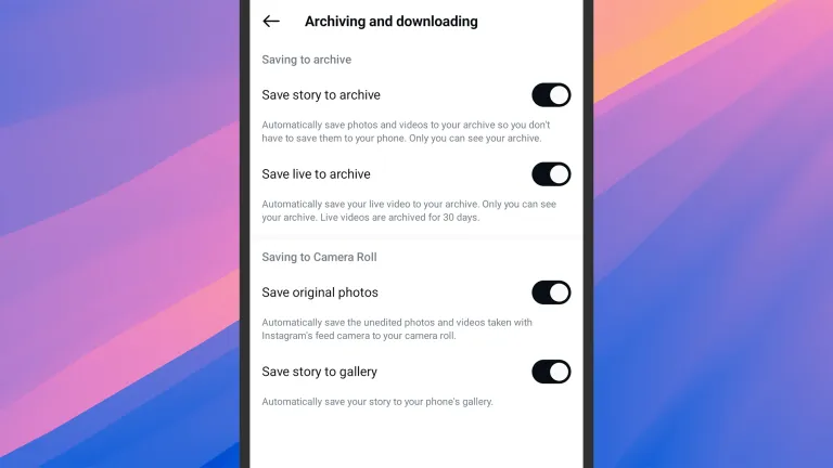 هناك إعدادات داخل تطبيق إنستغرام للتحكم في ذلك. اضغط على صورة ملفك الشخصي (أسفل اليمين)، ثم زر القائمة (أعلى اليمين): اختر الأرشفة والتنزيل (Archiving and downloading)، ثم شغّل مفاتيح التبديل الأربعة. هذا يعني أن يجري حفظ كل من المنشورات والقصص في مكتبة هاتفك، وحفظ القصص (ستوريز) والبث المباشر بصورة دائمة في الأرشيف الخاص بإنستغرام أيضاً.