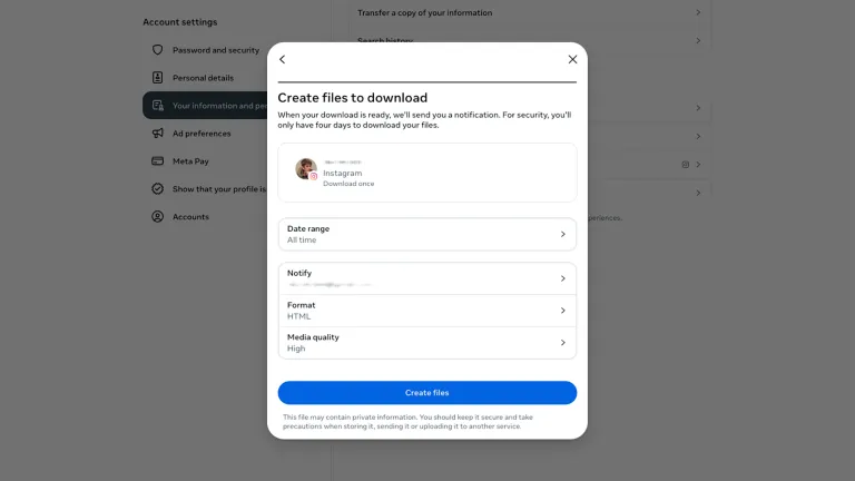 هناك طريقة أخرى لفعل ذلك: تصدير البيانات الموجودة في حسابك على إنستغرام كلها. في تطبيق الهاتف المحمول، اضغط على رمز ملفك الشخصي (أسفل اليمين)، ثم زر القائمة (أعلى اليمين)، ثم اضغط وفق الترتيب التالي على "مركز الحسابات" (Accounts Center) > "معلوماتك وأذوناتك" (Your information and permissions) > "تنزيل معلوماتك" (Download your information) > "تنزيل أو نقل المعلومات" (Download or transfer information) واختر حسابك. تأكد من تحديد الخيار "كل الأوقات" (All time) لنطاق التاريخ و"مرتفعة" (High) لمستوى جودة الوسائط. على الويب، يمكنك العثور على الخيار نفسه عبر النقر على خيار "المزيد" (More) > "الإعدادات" (Settings).