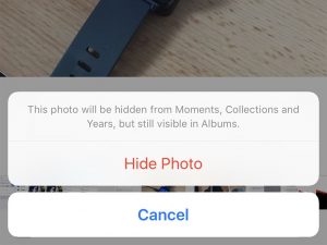 ضمن تطبيق الصور Photos قم باختيار الصور المطلوبة، ثم اضغط على زر المشاركة، واختر منه وظيفة الإخفاء Hide. بعد ظهور رسالة التأكيد والموافقة عليها ستصبح الصور التي اخترتها محجوبةً من عروض اللحظات Moments، المجموعات Collections، والسنوات Years، لكن ما زال يمكنك الوصول إلى تلك الصور من شاشة الألبومات Albums.