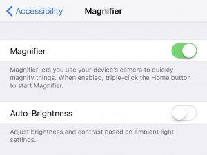 تعد إمكانية تكبير وتصغير الصور التي تراها الكاميرا مساعِدةً في جميع الحالات، مثل حالة النظر إلى قائمة الطعام في مطعمٍ بإضاءةٍ خافتة. لاستخدام هذه الوظيفة، اذهب إلى الإعدادات Settings، واختر العام General، ثم اختر إمكانية الوصول Accessibility، ثم اضغط على خيار المكبرة Magnifier لتفعيل الميزة. يمكنك أيضاً تفعيل الإضائة التلقائية، والذي يعني استجابة الكاميرا إلى مستويات الضوء المحيط.