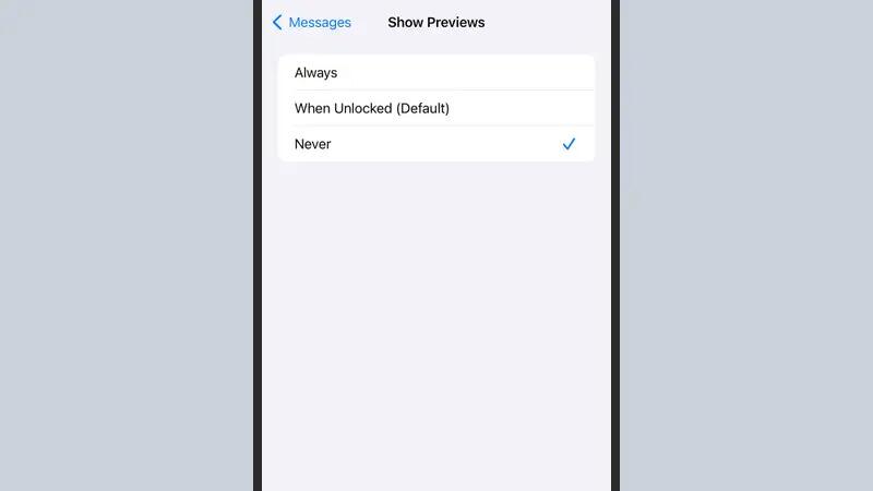 يمكنك أن تقي نفسك من ذلك بالتوجّه إلى الإعدادات في نظام آي أو إس (iOS) والنقر على الإشعارات (Notifications) ثم على الرسائل (Messages). انقر على خيار إظهار المعاينات (Show Previews) وغيّره إلى عند إلغاء القفل (افتراضي) (When Unlocked [Default]) لمنع إظهار المعاينات على شاشة القفل، أو إلى منع الإظهار (Never) لمنع إظهار المعاينات في أي مكان، ما يعني أنه عليك الانتقال إلى تطبيق مسجز (Messages) لقراءتها. ستعثر على إعدادات إظهار المعاينات نفسها في تطبيقات التراسل الفوري الأخرى، مثل واتساب (WhatsApp) وجوجل تشات (Google Chat). الخيار الآخر هو إيقاف تشغيل إشعارات تطبيقات التراسل الفوري تماماً، ويمكنك أن تعثر عليه في الشاشات نفسها.