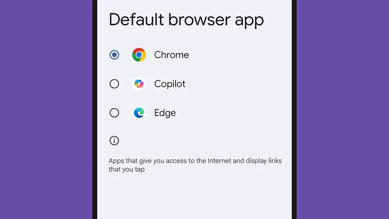 قد ترغب في تبديل متصفح الويب في أجهزة أندرويد، وذلك إذا كان لديك أكثر من خيار من هذه المتصفحات. انقر على خيار تطبيق المتصفح (Browser app) وحدد التطبيق الذي تريده من القائمة. سيفتح التطبيق الذي اخترته أي رابط ويب تريد تتبعه من دردشات الرسائل الفورية أو رسائل البريد الإلكتروني.