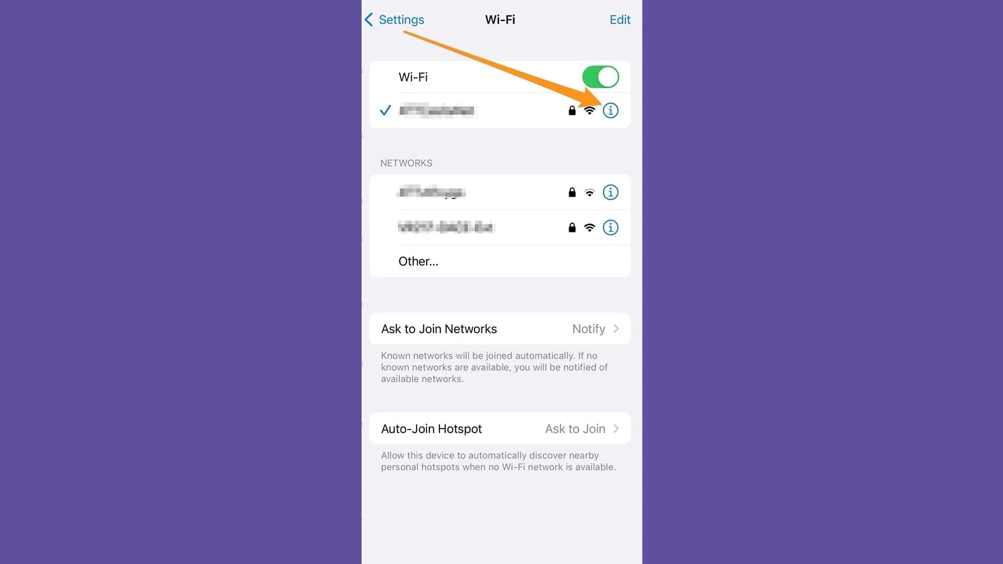 2. يوجد اسم الشبكة التي يتصل بها هاتفك أسفل زر تشغيل واي فاي، وستظهر علامة اختيار زرقاء بجواره. انقر على حرف (i) بجانب اسم الشبكة.
