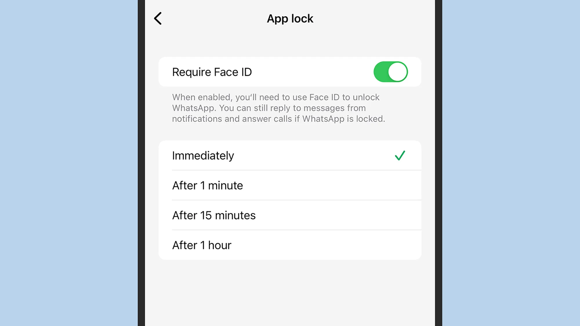 يمكنك أيضاً إعداد قفل التعرف على الوجه أو التعرف على اللمس في تطبيق واتساب، وهو إجراء مفيد للغاية لمنع المتطفلين من تصفح رسائلك. افتح نسخة واتساب في آيفون واختر الإعدادات (Settings) ثم الخصوصية (Privacy) ثم قفل التطبيق (App lock). اتبع التعليمات لإعداد معرف الوجه أو معرف اللمس في تطبيق واتساب.
