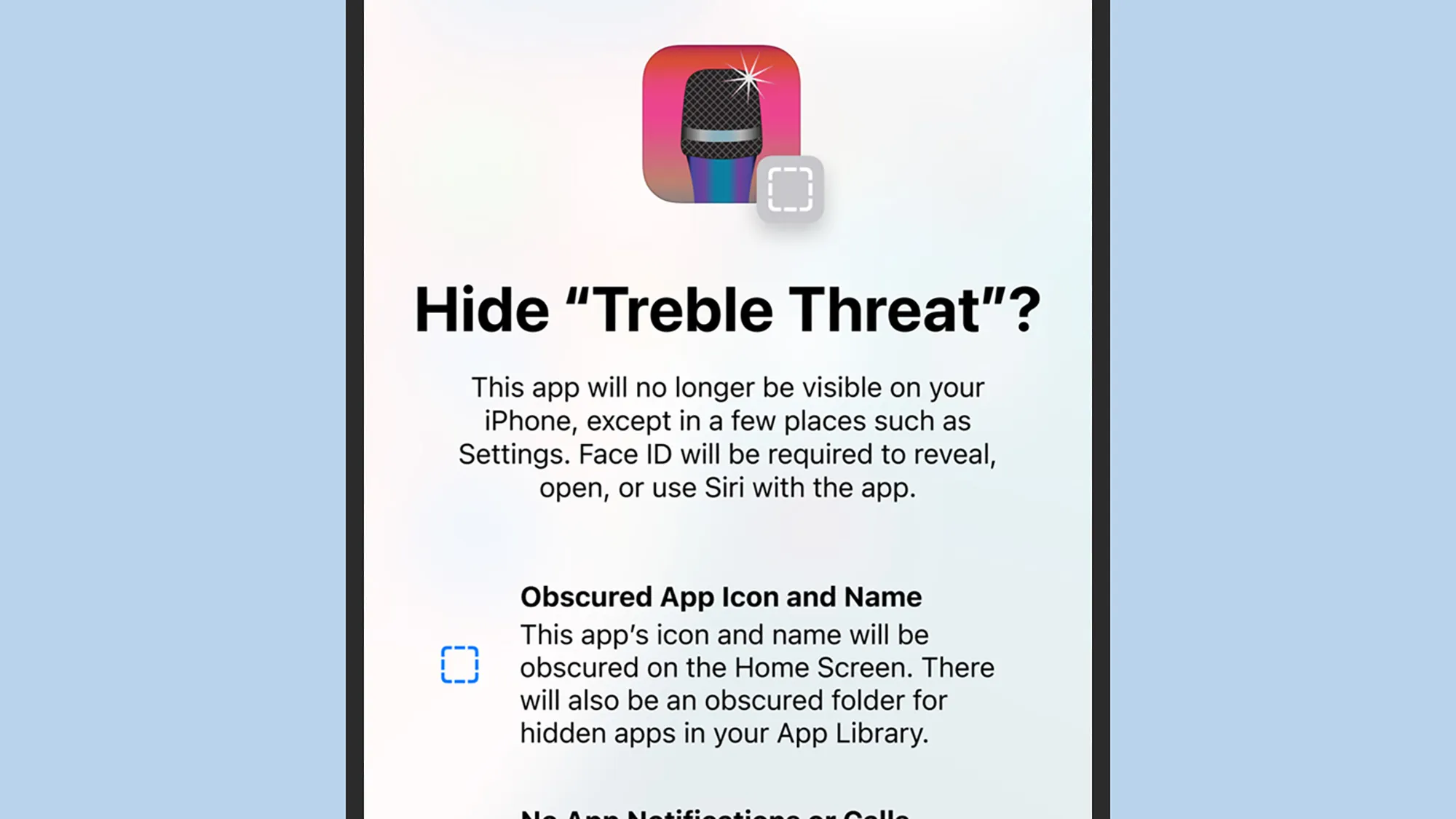 ثانياً، يمكنك أيضاً إخفاء هذه التطبيقات عن العرض إذا أردت. توضع التطبيقات المخفية في مجلد خاص باسم "تطبيقات مخفية" (Hidden) في مكتبة التطبيقات، ولكن أيقوناتها لا تظهر، وستكون هناك حاجة إلى استخدام مسح الوجه أو بصمة الإصبع للوصول إلى هذا المجلد. بالإضافة إلى ذلك، يُخفى المحتوى من هذه التطبيقات من إشعارات آي أو إس ونتائج البحث فيه.