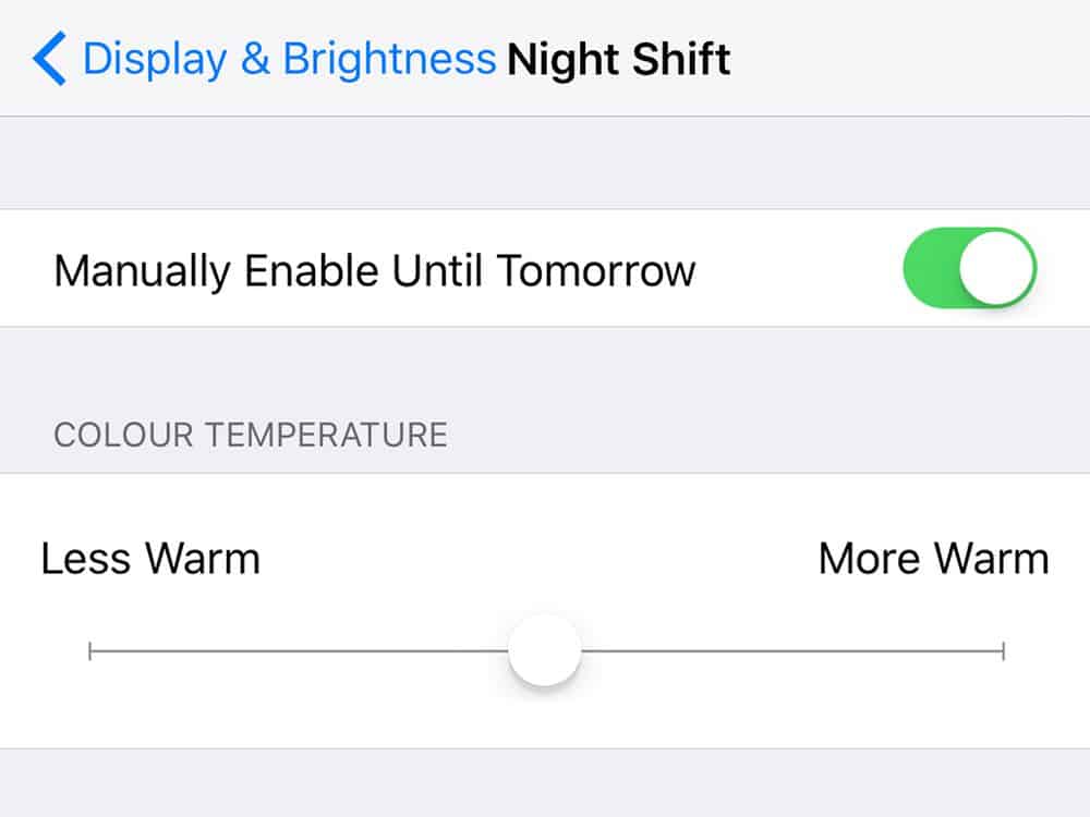 بالنسبة لمستخدمي آيفون، يوجد ميزة للتخفيف من الضوء الأزرق باسم نايت شيفت "Night Shift" مدمجة ضمن آي أو إس. ويمكن أن تعدل ألوان الشاشة آلياً بحيث تصدر الشاشة، أثناء ساعات المساء، إضاءة أقرب للون الأحمر من الأزرق. للعثور على هذه الميزة، افتح قائمة الإعدادات ومن ثم العرض والسطوع "Display&Brightness".