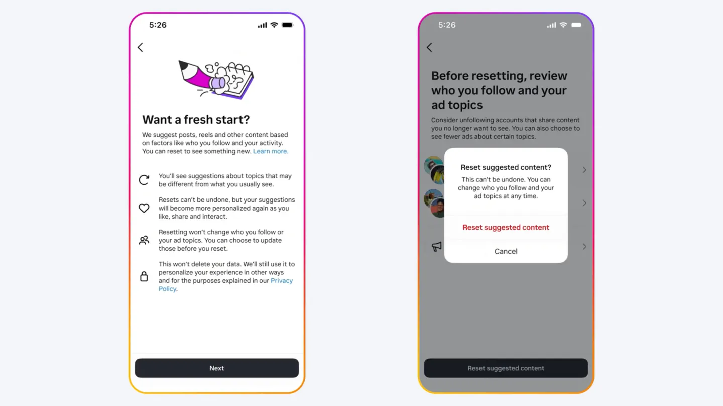 هناك طرق لإجراء تغييرات على خوارزمية إنستغرام، ومنها ميزة إعادة الضبط الجديدة التي تنطبق على صفحة "استكشف" (Explore) وصفحة "مقاطع الفيديو القصيرة" (Reels) وملخص إنستغرام الرئيسي (Feed). سنتحدث في هذا المقال عن الخيارات الجديدة المتاحة.