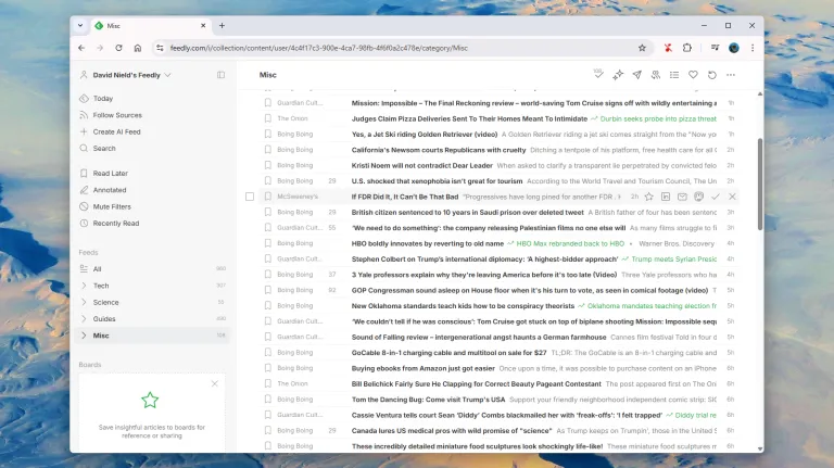 في أثناء تصفحك للمقالات في فيدلي، ستلاحظ مجموعة من الخيارات في أعلى كل مقال: يمكنك مشاركة المقال مع شخص آخر، أو وضع إشارة مرجعية عليه لقراءته لاحقاً، أو حفظه في لوحة. تعمل اللوحات في فيدلي بطريقة مشابهة للوحات في تطبيق بينتريست (Pinterest) أو تطبيق فليب بورد (Flipboard)، ما يتيح لك تنظيم المقالات التي تهمك بطريقة مختلفة عن المجلدات. يمكنك الوصول إلى مجموعة الخيارات نفسها من خلال تمرير المؤشر فوق عناوين المقالات.