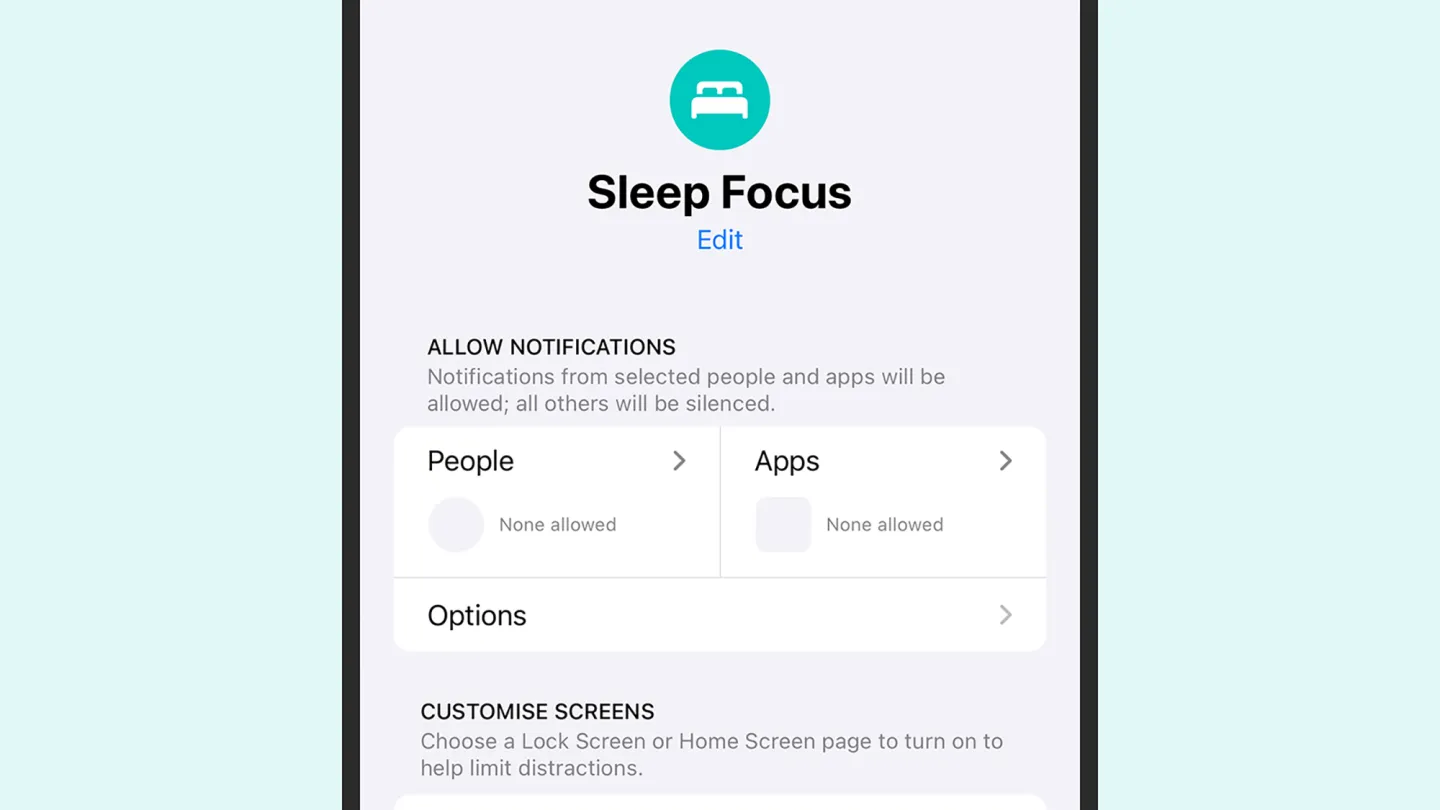 يمكن إضافة تخصيصات إضافية من خلال النقر على اختَر (Choose) أسفل الصور المصغرة لشاشة القفل أو الشاشة الرئيسية، ويستطيع عندها جهاز آيفون التبديل إلى شاشة قفل أو شاشة رئيسية محددة عندما يكون وضع تركيز النوم مفعلاً (ربما شاشة تحتوي على عدد أقل من عوامل التشتيت). هناك قائمة خيارات أخرى هنا تتيح لك تفعيل شاشة قفل خاصة باسم "شاشة النوم" (Sleep Screen)، وهي نسخة مبسّطة من شاشة القفل الحالية تخفي خلفية الشاشة.