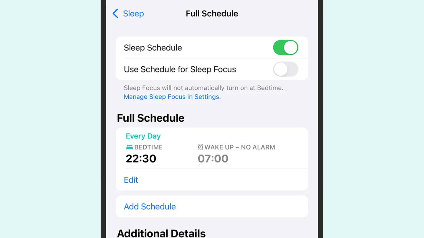 يمكنك أيضاً ضبط جدول مواعيد للنوم إلى جانب وضع تركيز النوم إذا أردت، ويعني ذلك أن هذا الوضع سيعمل تلقائياً في أوقات معينة من اليوم، ما يوفر عليك عناء تفعيله يدوياً (على الرغم من أنك ستتمكن من فعل ذلك أيضاً) ويضمن لك الخلود إلى النوم في الوقت نفسه كل ليلة.