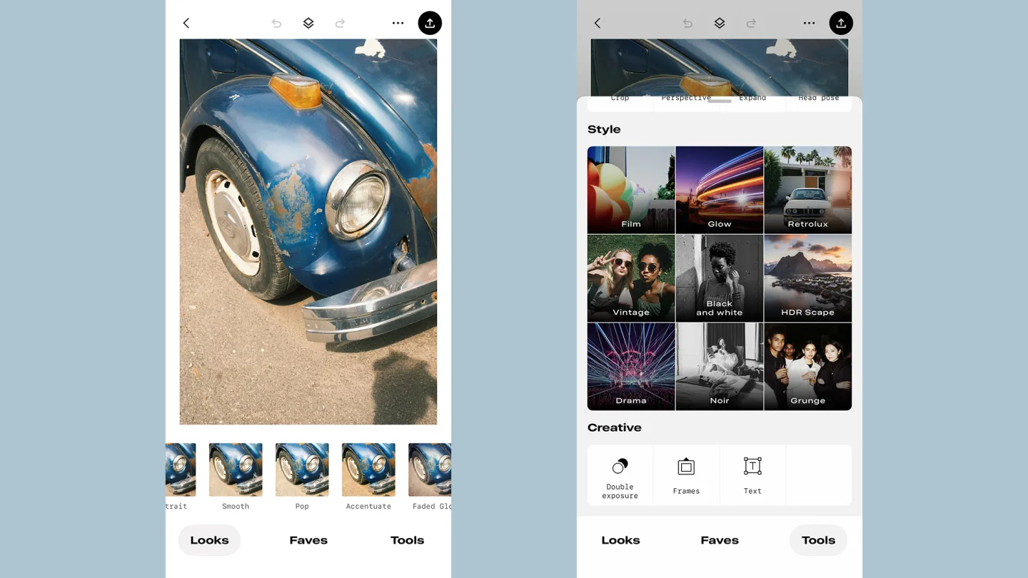 في الواقع، ثمة بعض الفلاتر الإضافية في علامة التبويب "الأدوات"، بما في ذلك "كلاسيكي" (Vintage) و"فيلم" (Film) و"غرانج" (Grunge). تسمى هذه الفلاتر في هذا الجزء من التطبيق بالأنماط، وهي مزودة بمزيد من خيارات التخصيص، مثل قوة التأثير أو طريقة تطبيقه. لكل نمط خياراته الخاصة، على سبيل المثال، يتيح لك تأثير النمط "الأسود والأبيض" (Black and white) تعديل السطوع والتباين على نحو منفصل.