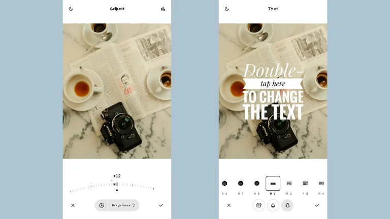 يعد وضع "الصورة الشخصية" (Portrait) مفيداً لإضافة لمسات مميزة على الصور التي يكون فيها وجه واحد هو الموضوع الرئيسي، بينما يتيح لك وضع "النص" (Text) إضافة بعض التأثيرات النصية الأساسية: حدد اختيارك من الحامل الدائري في الأسفل، ثم اضغط ضغطة مزدوجة على النص نفسه لتغيير الكلمات والحروف. استخدم وضع "الإطارات" (Frames) لإضافة مجموعة مختارة من الحدود المختلفة إلى صورتك.