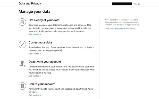 بمجرد تسجيلك للدخول، سترى اللائحة التالية من الإعدادات. اختر العنصر الأول منها، والمسمى "الحصول على نسخة من بياناتك"، لتحصل على نسخة منها، وكي ترى ما الذي تعرفه آبل عنك.