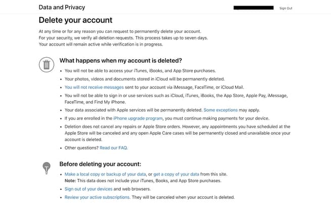 في حال كنت قد طلبت بياناتك من قبل، لكن لم تصلك بعد، نوصيك بالتريث وعدم القيام بالحذف أو إلغاء تنشيط حسابك، حتى تصلك بياناتك السابقة. وإلا فإن شركة آبل ستقوم بإلغاء أي طلبات غير تامة للبيانات بمجرد حذف حسابك أو كونه غير نشط.