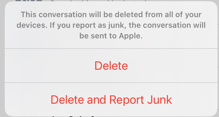 بعد فعل ذلك، سيظهر إما خيار حذف الرسالة (Delete) وإما حذف الرسالة والإبلاغ عن أنها غير مرغوب فيها (Delete and Report Junk). يمنع الخيار الثاني استلام الرسائل من المرسل المحدد في المستقبل.