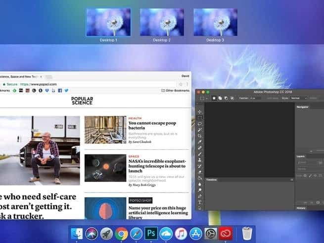 مثل العديد من أسطح المكتب على نظام التشغيل ويندوز، تبدو المساحات المتعددة على نظام ماك أو إس نفسها في حالتها الافتراضية. يمكنك الوصول إلى نفس شريط القائمة وشريط التطبيقات "دوك" من أي منها. ومع ذلك، تسمح لك آبل بتعديل كل مساحة لتبدو فريدة.