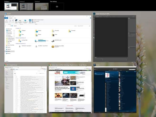 وبمجرد إنشاء عدة أسطح المكتب وتشغيلها، يمكنك التبديل بينها عن طريق الرجوع إلى شاشة عرض المهام والضغط على الصور المصغرة التي تظهر في الأعلى. أو، من نفس العرض، انقر على أي نافذة فردية: عند التبديل إلى هذا البرنامج المحدد، ستنتقل أيضاً إلى سطح المكتب حيث مكانه حالياً. يمكنك أيضاً التنقل إلى الخلف وإلى الأمام من خلال مجموعة من أسطح المكتب من خلال الضغط على Windows + Ctrl ثم النقر على مفتاح السهم الأيسر أو الأيمن.