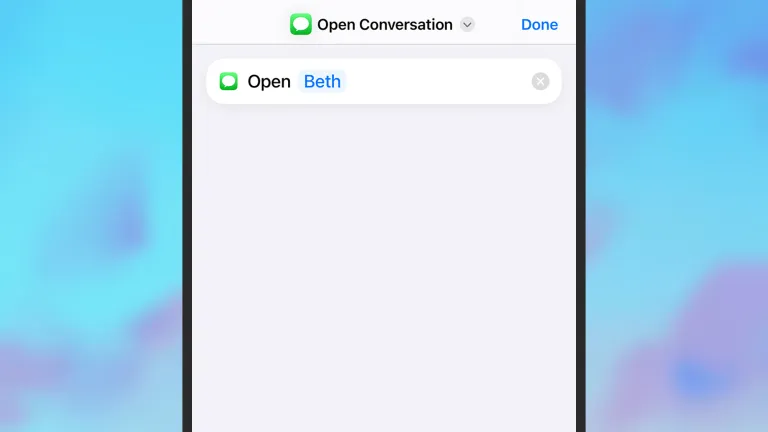 تعمل ميزة نظام آي أو إس 18.4 الجديدة هذه من خلال تطبيق الاختصارات، لذا توجه إلى هناك أولاً. اضغط على الرمز "+" في الزاوية العلوية اليمنى، ثم ابحث عن اختصار "افتح المحادثة" في مربع النص. عندما يظهر الرابط، اضغط لتحديده.