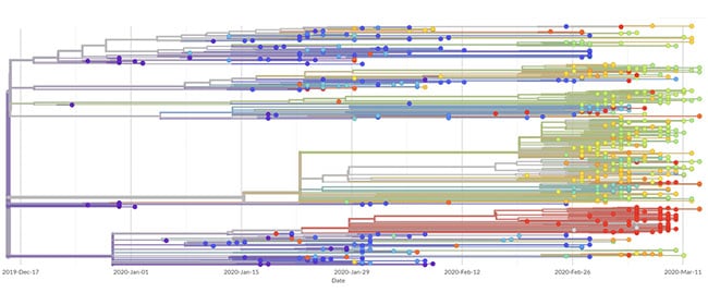 بالنسبة لفيروس كورونا، كانت هناك مبادرات عالمية لتبادل الجينوم الفيروسي مع جميع العلماء. بالنظر إلى مجموعة من التسلسلات الجينية للفيروس مع تواريخ أخذ العينات، يمكن للعلماء استخلاص التاريخ التطوري للعينات في الوقت الفعلي، واستخدام المعلومات لاستنتاج تاريخ انتقاله.
