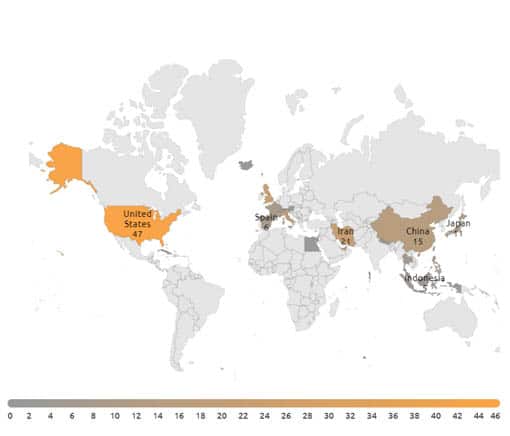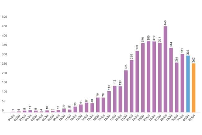 دليل الألوان: تتغير الألوان مع كل شهر. نظراً لأن الأرقام يتم تحديثها تدريجياً على مدار اليوم بإعلانات الولاية والأقاليم ، يظل اليوم الأخير أصفر (مما يشير إلى أنه غير مكتمل) حتى يتم إجراء جميع الإعلانات.
