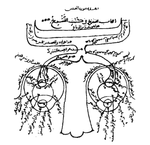 قدّم ابن الهيثم في كتابه المناظر مخططاً تفصيلياً لتشريح العين، وصف فيه الأجزاء المختلفة للعين وأظهر مسارات الأعصاب البصرية، بالاعتماد على نظرية جالينوس حول الرؤية.