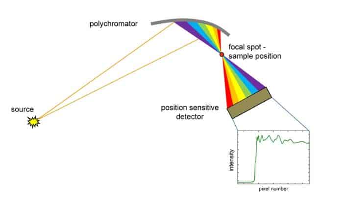 يتميز هذا النظام على جمع طيف امتصاص الأشعة السينية بالكامل في وقت واحد مما يجعل التقنية مفيدة بشكل خاص لدراسة العمليات السريعة. ويتميز أيضاً أن حجم الحزمة المركزة يكون في موضع العينة صغيراً ومستقراً جداً نظراً لعدم الحاجة إلى حركة العناصر البصرية لجمع البيانات الطيفية.