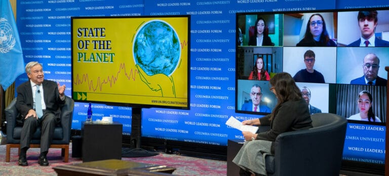 حذّر أنطونيو غوتيريش؛ الأمين العام للأمم المتحدة، ممّا وصفها بالحرب الانتحارية التي يشنّها البشر ضد الطبيعة. ودعا إلى تعزيز العمل على صعيد عدة مجالات لمنع الانزلاق إلى الفوضى ولتغيير علاقة البشر مع الطبيعة وبعضهم البعض. جاء ذلك في خطاب ألقاه في فعالية لجامعة كولومبيا الأميركية.