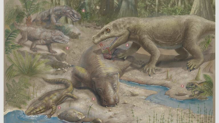 عندما ماتت هذه الحيوانات أثناء الانقراض الجماعي في نهاية العصر البرمي، لم يحل شيء محلها، تاركة أنظمة بيئية غير متوازنة لعشرة ملايين سنة. بعد ذلك، بدأت الديناصورات والثدييات الأولى في التطور في العصر الترياسي، على مدار حوالي 10 مليون سنة. كانت الديناصورات الأولى صغيرة، وتأكل الحشرات وذات قدمين ويبلغ طولها حوالي متر واحد، لكنها سرعان ما أصبحت أكبر ومتنوعة وآكلة لحوم ونباتات.