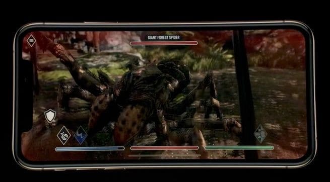العرض التجريبي الأول هو للعبة جديدة من بيثيسدا (بليدز) لاستعراض قدرات آيفون الجديد؛ وتنتمي بليدز إلى فئة ألعاب تقمُّص الأدوار، وهي تقع ضمن بيئة لعبة إيلدر سكرولز، وقد حرص مقدِّمها على مقارنة أداء الجهاز مع منصات الألعاب عالية الأداء، وليس الحواسيب الشخصية، وذلك تجنباً لإثارة استياء المتعصبين من عشاق اللعب على الحواسيب.