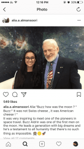 نجمة الإمارات علياء المنصوري، ابتكرت تجربةً أبهرت لجنة تحكيم المسابقة. حيث تهدف تجربة المنصوري إلى حماية رواد الفضاء من موت الخلايا غير المحبّذ، عبر دراسة أي تغييرات قد تطرأ على التركيب البروتيني للحمض النووي، مما يفضي إلى توفير أدلة ونتائج حول كيفية منع موت الخلايا غير المرغوب فيه، للحفاظ على صحة رواد الفضاء في المستقبل، خلال البعثات الطويلة إلى الفضاء الشاسع.